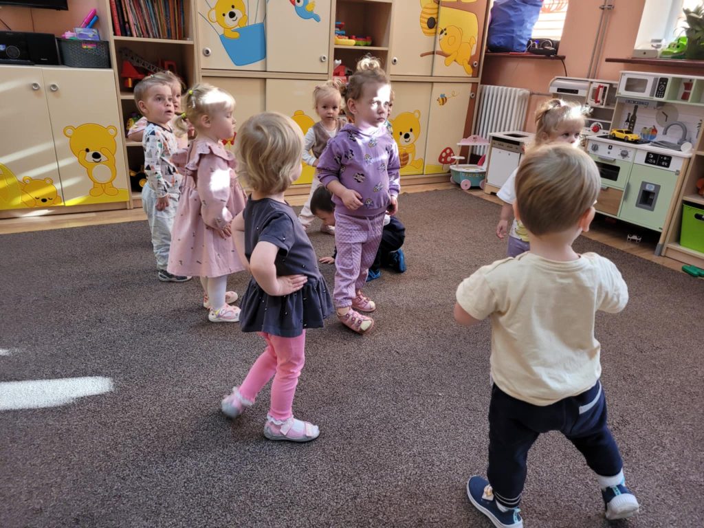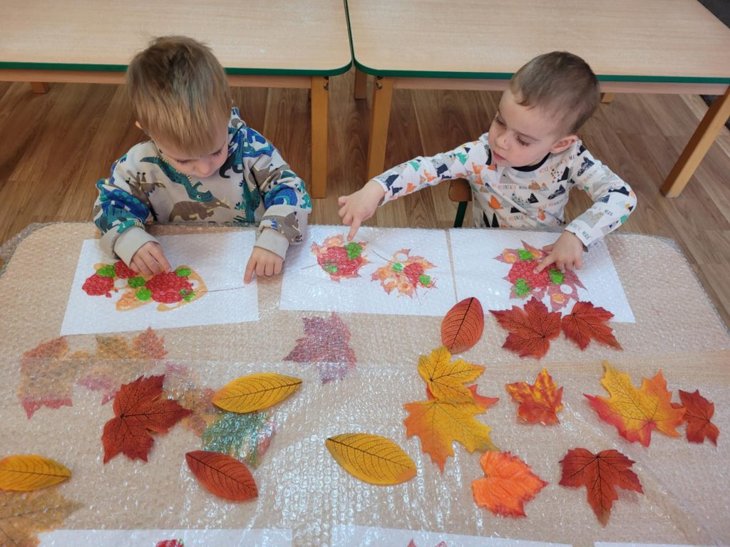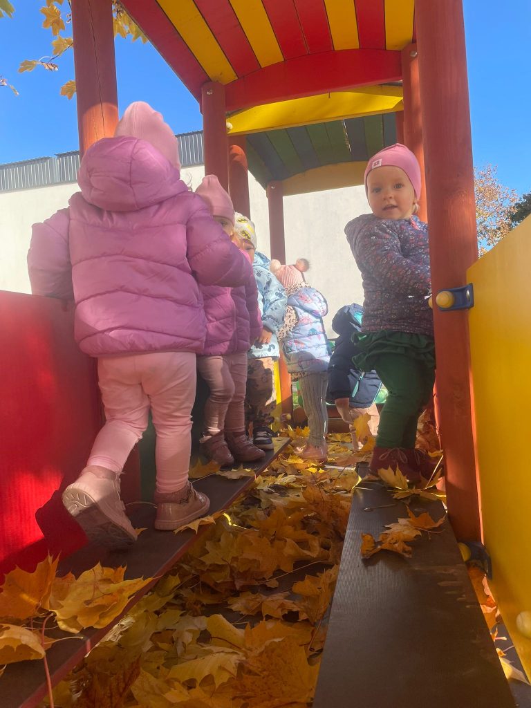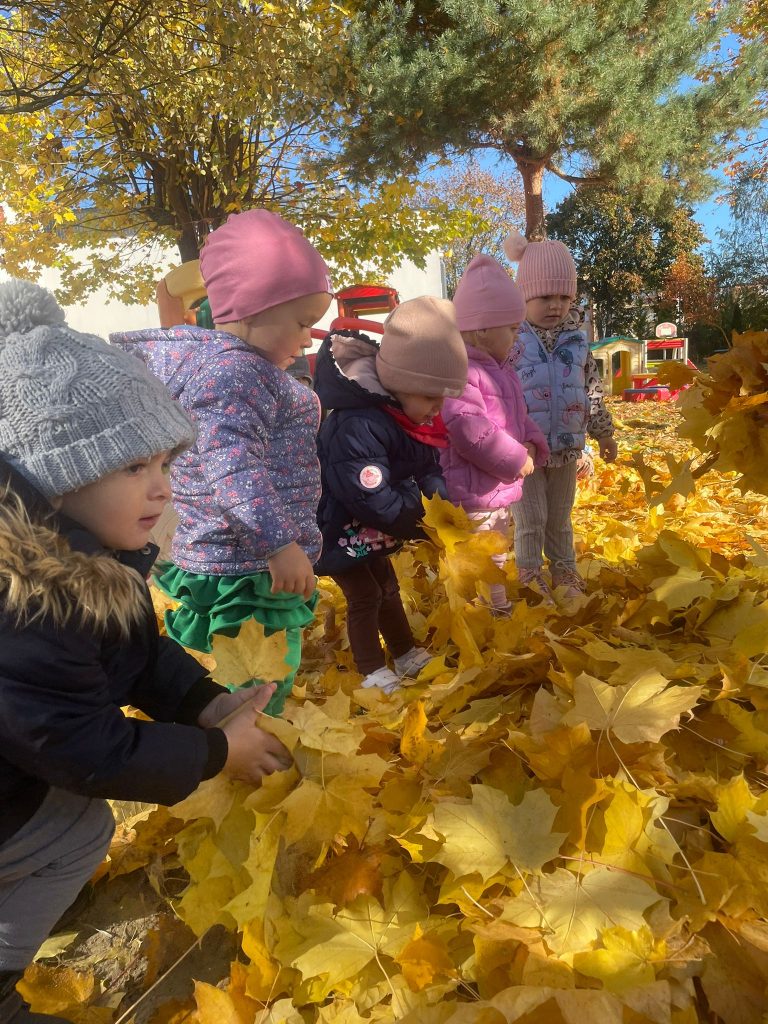 Złota jesień powoli dobiega końca, ale zostawiła nam wiele kolorowych chwil. Dzieci z zaangażowaniem bawiły się liśćmi, obserwowały ich kształty i kolory, a następnie wykorzystywały je w swoich pracach plastycznych. Było też dużo ruchu — maluszki tańczyły jak lekkie, opadające listki, ciesząc się wspólną zabawą.