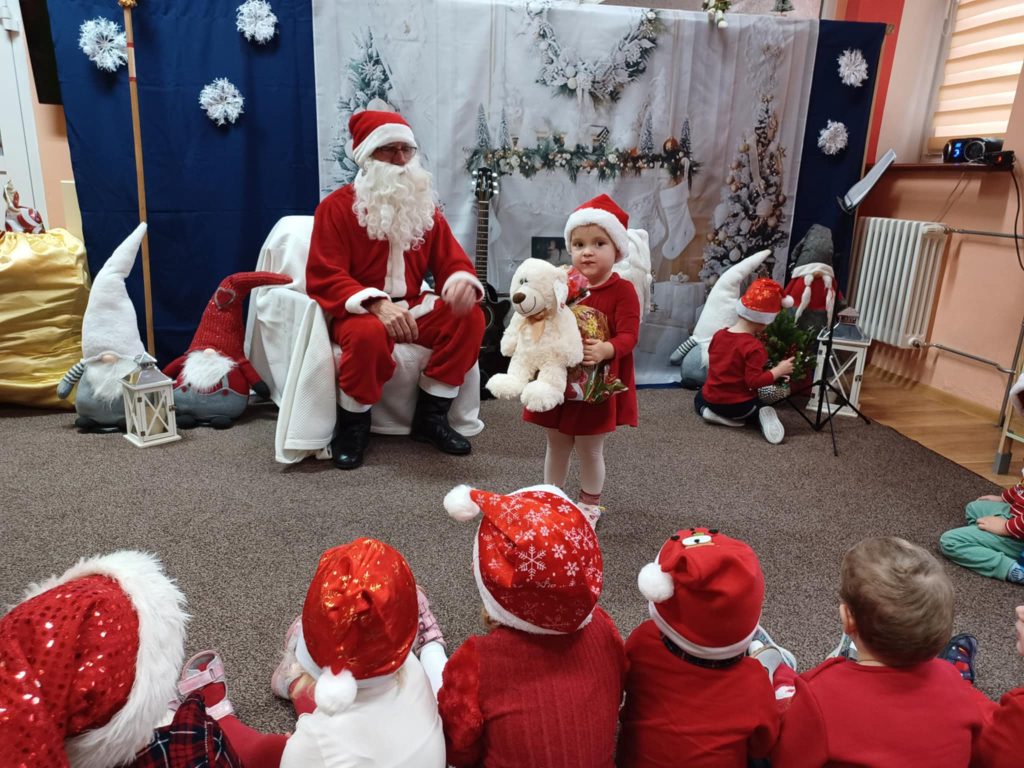 Dzisiejszy dzień przyniósł naszym maluchom mnóstwo radości — odwiedził nas sam Święty Mikołaj! Dzieci z ciekawością i wielkim przejęciem powitały gościa, a krótka wspólna piosenka wprowadziła wszystkich w świąteczny nastrój. 🎄✨